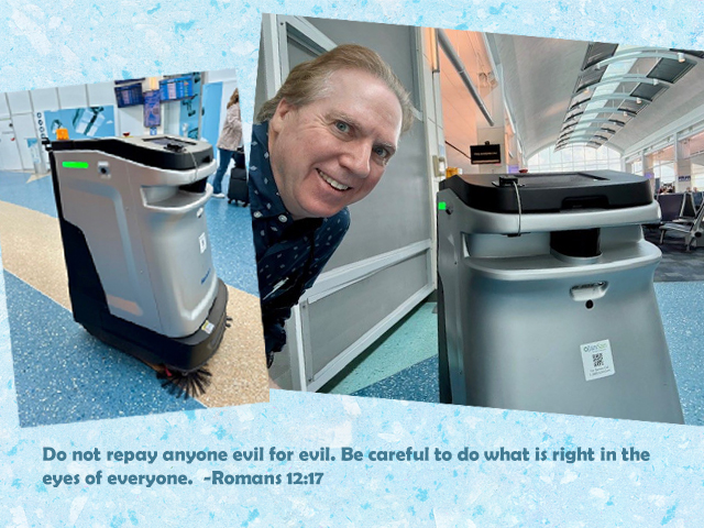 A determined “servant” (mechanical though he be) was simply trying to follow his course, and I repeatedly stood in his way. Rather than sound an alarm or flash a light, the calm voice said, “Excuse me. I’m going this way. Please step aside.”